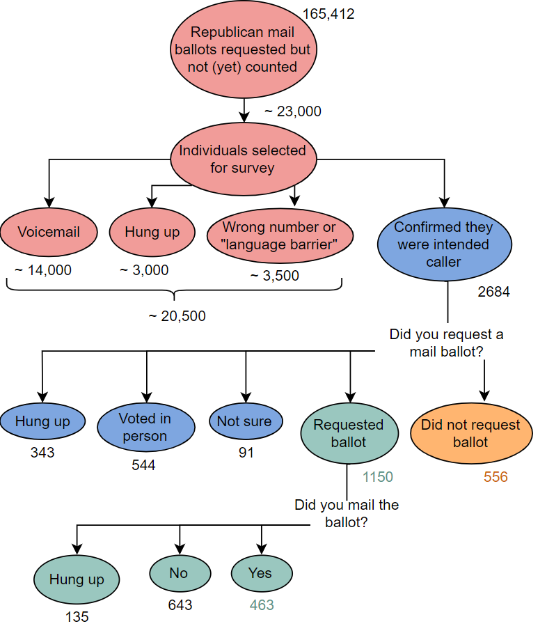 Phone surveys of \(n = 2250\) of those voters identified \(556\) who claimed not to request ballots.