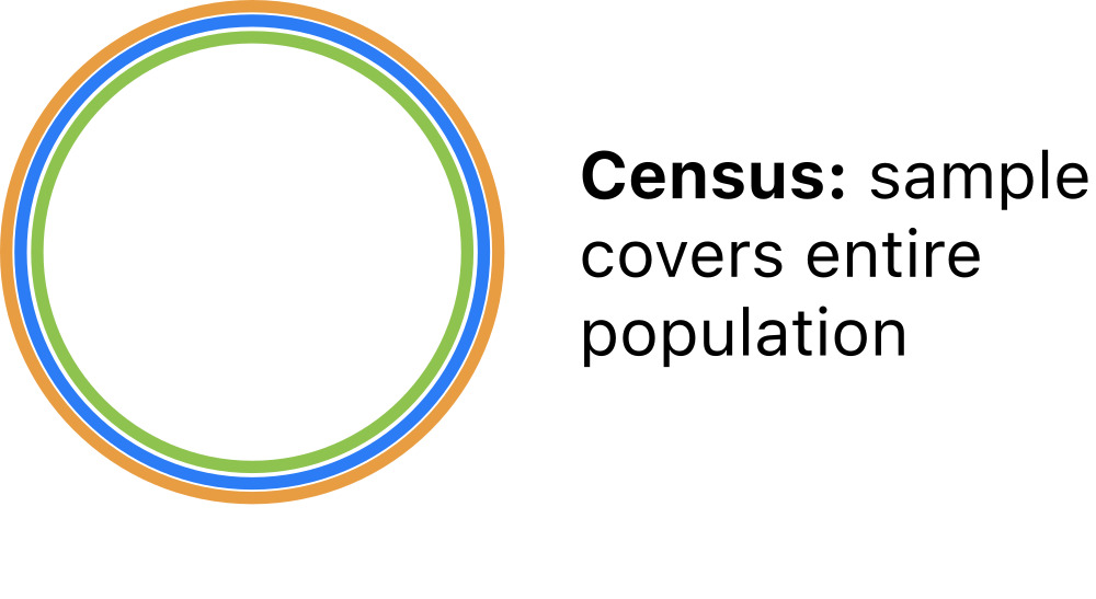 We can now imagine a few common sampling scenarios by varying the relationship between population, frame, and sample.
